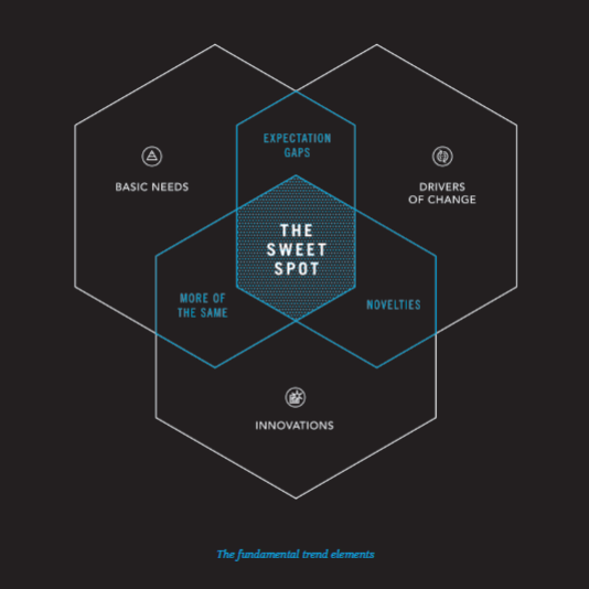 În cartea “Trend-Driven Innovation — Beat Accelerating Customer Expectations”, autorii prezintă trei mari elemente care stau la baza unui astfel de Trend. Este vorba de Nevoi de Bază, Factori Promotori ai Schimbării (Drivers of Change) şi Inovaţii. Un trend se regăşeşte în punctul de tensiune dintre aceste trei elemente.